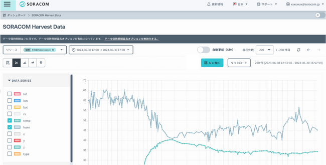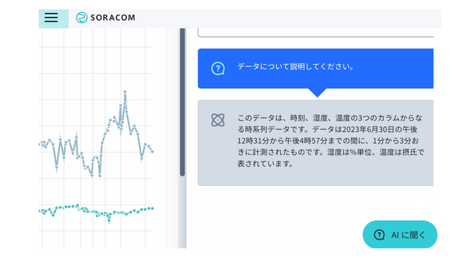 「AIに聞く」ボタンからSORACOM Harvest Data Intelligenceを立ち上げ、データ解析を行う