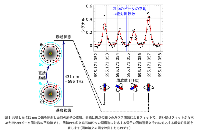 時計遷移の探索では、30 µKの極低温までレーザー冷却・捕獲したイッテルビウム171原子に、上述の励起用安定化レーザーを照射し、励起された原子を検出するようにしました。この励起された原子数に相当するシグナルの変化を注意深く観察しながら励起用レーザーの周波数を変化させることで、波長431 nmにある時計遷移の絶対周波数の測定に成功しました。図1はその絶対周波数の正確な決定のために、詳細な分光測定を行った結果を示しています。シグナルが大きくなっているところが、励起用レーザー周波数と原子の遷移周波数が一致しているところです。この遷移の励起状態には、電子の回転運動の向きに応じたいくつかの副構造があり、四つのピークはその副構造に対応します。得られたスペクトル形状を理論曲線でフィットし、四つのピークの平均値として中心周波数を求めることで、波長431 nmの時計遷移の絶対周波数を決定しました。このように、波長431 nmの時計遷移について、基底状態の原子を対象となる励起状態に直接励起したときの遷移周波数の絶対値を精密に測定したのは世界初となります。