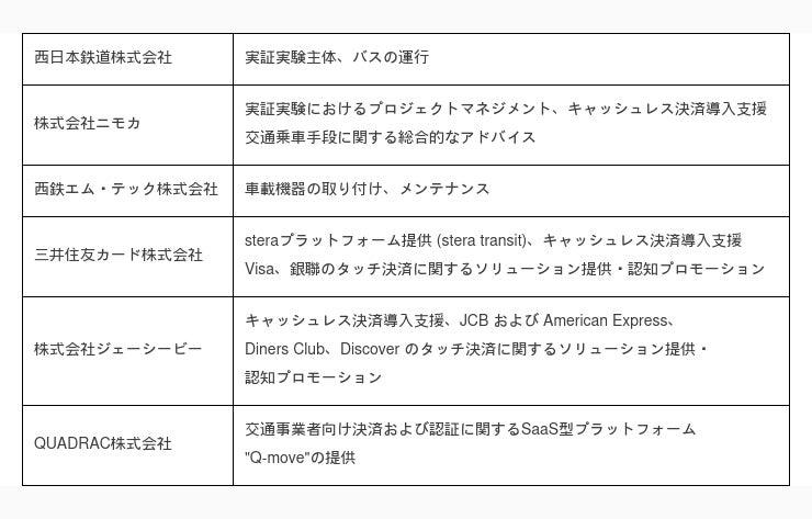 西日本鉄道株式会社(本社:福岡県福岡市、代表取締役社長執行役員:林田 浩一、以下「西日本鉄道」)、株式会社ニモカ(本社:福岡県福岡市、代表取締役社長:田端 敦)、西鉄エム・テック株式会社(本社:福岡県福岡市、代表取締役社長:丹山 裕和)三井住友カード株式会社(本社:東京都江東区、代表取締役社長:大西 幸彦、以下「三井住友カード」)、株式会社ジェーシービー(本社:東京都港区、代表取締役兼執行役員社長:二重 孝好、以下「JCB」)、QUADRAC株式会社(本社:東京都港区、代表取締役社長:高田 昌幸)は、西鉄バスの一部路線(博多駅~福岡空港国際線)において、三井住友カードが提供する公共交通機関向けソリューション「stera transit」を活用し2023年7月10日より、タッチ決済によるバス乗車の実証実験を開始いたします。また、対象路線拡大(Fukuoka BRT(連節バス)への導入)、ならびに銀聯ブランド追加を2023年8月に予定しています。