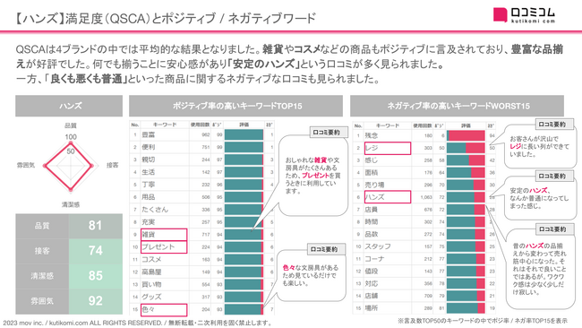 今回は、このAI解析を用いて【ハンズ】 のQSCA・ポジ / ネガキーワードを確認しました。