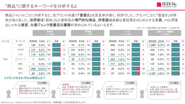 商品ジャンルごとに分析すると、全ブランド共通で「豊富さ」は言及率が高く、好評でした。ブランドごとに「豊富さ」の特色がありました。世界堂は「画材」など美術系の専門的な商品、伊東屋は高級な筆記具をはじめとする文具、ハンズはおしゃれな雑貨、丸善ジュンク堂書店は書籍が求められているといえます。