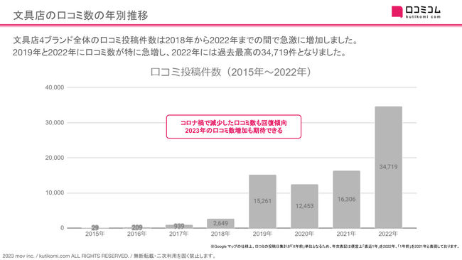 文具店4ブランド全体の口コミ投稿件数は2018年から2022年までの間で急激に増加しました。 2019年と2022年に口コミ数が特に急増し、2022年には過去最高の34,719件となりました。