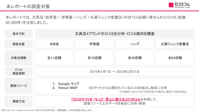 今回は、文具店(世界堂 / 伊東屋 / ハンズ / 丸善ジュンク堂書店)の全154店舗に寄せられた口コミ(総数82,565件)を分析しました。