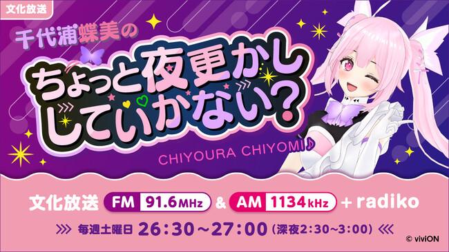 VTuberプロダクション・あおぎり高校(運営:株式会社viviON、所在地:東京都千代田区、 代表取締役:明石耕作)のVTuber・千代浦蝶美(ちようら ちよみ)がパーソナリティーを務めるラジオ番組『千代浦蝶美のちよっと夜更かししていかない?』が、文化放送において7月8日(土) から放送を開始します!