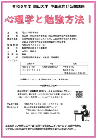 【岡山大学】公開講座「心理学と勉強法1」〔7/23,日 岡山大学教育学部〕