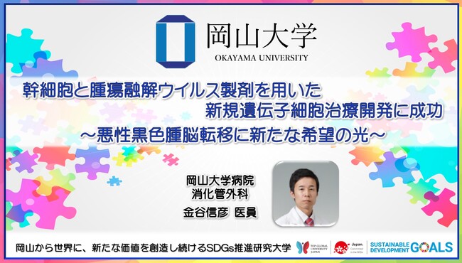国立大学法人岡山大学(本部:岡山市北区、学長:那須保友)の岡山大学病院低侵襲治療センターの黒田新士講師、消化管外科の金谷信彦医員らの研究グループは、ハーバード大学医学大学院ブリガム・アンド・ウィメンズ病院脳神経外科との共同研究において、悪性黒色腫の難治性脳転移マウスモデルに対して、遺伝子改変間葉系幹細胞を用いた新規腫瘍融解ウイルス免疫療法の開発に成功しました。