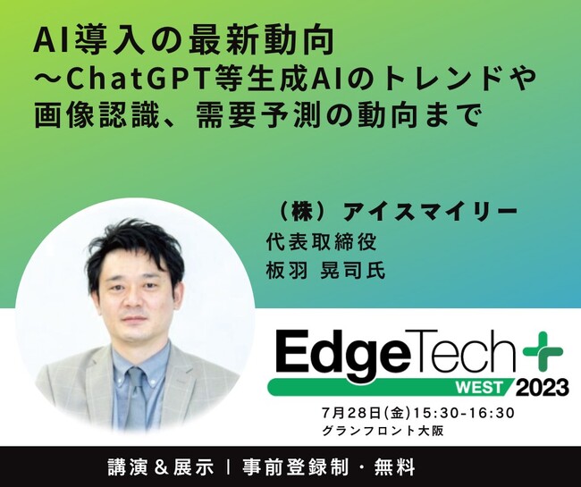 2023年7月28日にグランフロント大阪で開催されるEdgeTech+ WESTの基調講演にて、「AI導入の最新動向 ~ChatGPT等生成AIのトレンドや画像認識、需要予測の動向まで~」というテーマで株式会社アイスマイリー代表取締役の板羽が登壇いたします。ぜひご来場ください。
