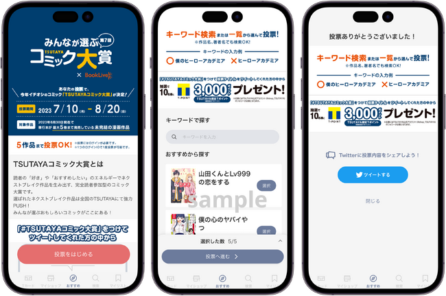 ※投票フォームへは、TSUTAYAコミック大賞特設ページ( http://tsutaya.jp/tsutaya-comic/ )内の「TSUTAYAアプリで投票する」もしくはTSUTAYAアプリ内のTSUTAYAコミック大賞バナーをクリック