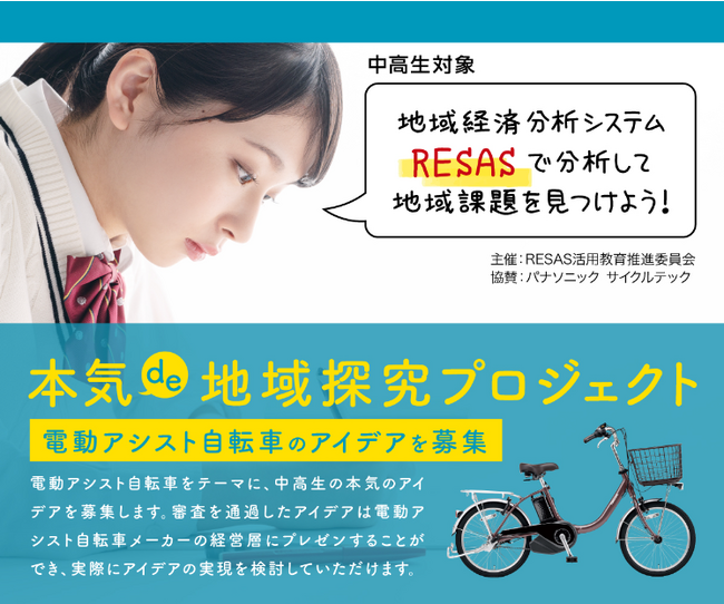 パナソニック サイクルテック株式会社(以下、パナソニック サイクルテック)は、RESAS活用推進委員会が主催する自宅de地域探究に協賛し、中高生向け探究学習コンテスト「地域応援アイデアコネクト」内で特別プロジェクト「本気de地域探究プロジェクト」を実施します。このプロジェクトにおいて、中高生のみなさんに、地域経済分析システム(RESAS(※))等を活用して地域課題を発見し、課題解決プロセスとアイデアの発案を行っていただきます。