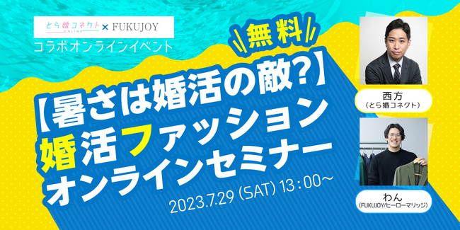 このたびとら婚コネクトでは、夏の季節にぴったりな婚活ファッションのコーディネートについて、恋活・婚活ファッションのコーディネートで実績のあるFUKUJOYと合同で、無料のオンラインファッションセミナーを開催いたします。