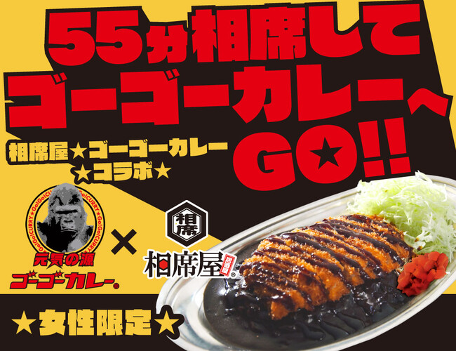 株式会社ゴーゴーカレーグループ(本社:石川県金沢市、CEO兼代表取締役社長:西畑誠、以下ゴーゴーカレー)は、相席屋を運営する株式会社セクションエイト(本社:東京都渋谷区、代表取締役社長:安田 隆之、以下セクションエイト) とコラボレーションし、相席する時間や回数に応じてゴーゴーカレーが無料になる 女性限定のキャンペーンを、7月15日から開始すると発表しました。