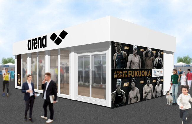 会場外に開設する『アリーナ』のブースは、日本はもちろん、各国のトップレベルで活躍する着用選手のビジュアルを大きく壁にデザインし、記念品の販売など大会会場や周辺を訪れたお客様にPR活動を行います。また、不要になったゴーグルを回収するボックスも設置。これは2018年から『アリーナ』が取り組んでいる、不要になったゴーグルを回収しリサイクルする活動で、この活動は「世界水泳2023福岡大会」および「世界マスターズ水泳選手権2023九州大会」関連プロジェクトとしても認証されました。
