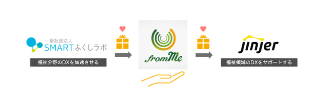 jinjerは、ファンドレイジング協会が開発するカードゲーム「from Me」を一般社団法人SMARTふくしラボ(以下、SMARTふくしラボ)から、「from Me」体験会をギフトという形でjinjerが受け取り、ふくしDX推進の一環で進めている「MOVE ON PROJECT」のメンバーで、「from Me」を実践していきます。このSMARTふくしラボから始まるペイ・フォワード型の取り組みについて、jinjerとして幅広い領域で認知活動などを中心に推進していきます。