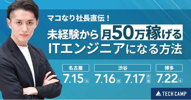 プログラミングスクール「テックキャンプ」を運営する株式会社div(本社:東京都 渋谷区、代表取締役社長 石原 圭、以下「div(ディブ)」)は、ディブの創業者でありテックキャンプを開校した真子 就有氏による無料特別セミナー「未経験から月50万稼げるITエンジニアになる方法」(以下、本セミナー)を、7月15日から全国3都市(愛知県名古屋市、東京都渋谷区、福岡県福岡市博多区)で開催します。