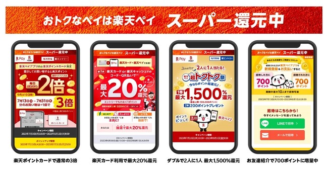 「楽天ペイ」アプリでは、今夏「おトクなペイは楽天ペイ スーパー還元」キャンペーンとして、「楽天ペイ」アプリ内の「楽天ポイントカード」を提示して会計すると、「楽天ポイント」が通常の3倍進呈されるキャンペーン、「楽天ポイントカード」提示と「楽天ペイ」アプリ利用で最大1,500%還元される「2人に1人当たる!楽天ペイ超トクトク祭」、「お友達紹介キャンペーン」などさまざまなお得なキャンペーンを実施します。