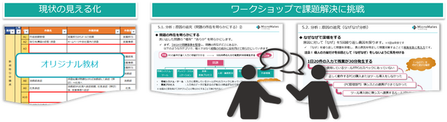 実際の業務例をもとにしたマイクロメイツオリジナルの教材を使用して、現状の見える化・問題の抽出・原因の追究・施策の検討をワークショップで行います。