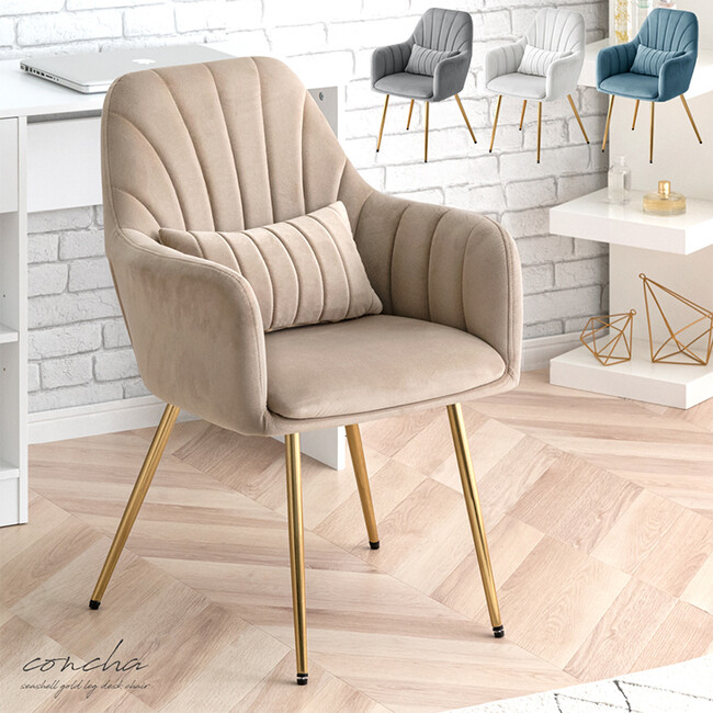 こちらも1.と同じシェルデザインのチェアです。ゴールドの4本脚が特徴的で、高級感ある美しいデザインとなっています。目立ちやすいゴールドカラーですが、華奢な脚なので悪目立ちすることもなく、くすみカラーやベロア調の生地とも相まって、程よく大人っぽい上品な見た目になっています。