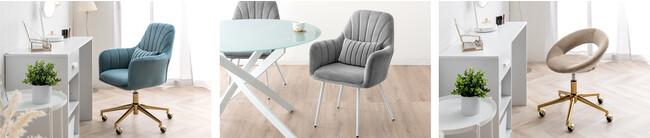 8モデルともデスクやドレッサー、テーブルに合わせることができます。デザインの好みや、お持ちの家具・インテリアに合わせてカラーや座面・脚部フレームの形状などをお選びいただけます。