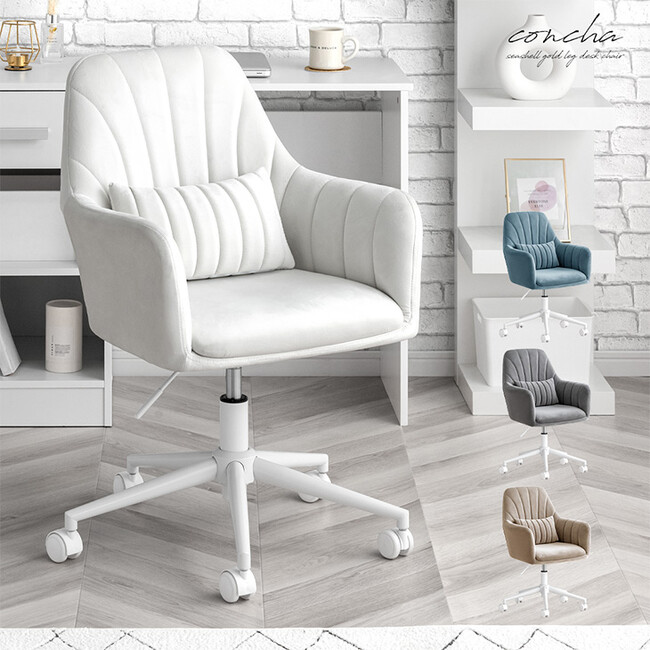 1.と同じシェルデザインを用いたゴールド脚のデスクチェアです。キャスター部分にもゴールドのパーツを使いこちらも統一感のあるデザインになっています。座面のくすみカラーとゴールドフレームの相性が良く、大人っぽくエレガントな印象がありながらも、くすみカラーのフェミニンな雰囲気を演出します。