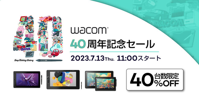 設立40周年を祝う企画の一つとして、これまで40年にわたり、ワコムを支えてくださったお客様への感謝を込めて、2023年7月13日(木)11:00から直販サイト「ワコムストア( https://estore.wacom.jp/ja-JP/ )」で「ワコム40周年記念セール」を開催します。