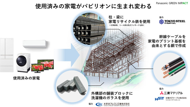 パナソニックグループでは、2013年より、東京製鐵株式会社(以下、東京製鐵)とともに、家電リサイクル工場から回収した鉄スクラップを再び製品材料の鉄として使用する資源循環のスキームを構築しています。パビリオンの建築においても、パビリオンで利用する鉄約118トン(付帯鉄骨、リース部分およびファサードを除く)の約82%、主な柱・梁(接合部のプレート等を除く)約98%にあたる97.1トンに、このリサイクル鉄を用います。また、万博の期間終了後には、再度、東京製鐵に戻し、パナソニックグループの製品等の材料として使用していきます。