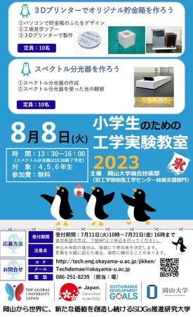 国立大学法人岡山大学(本部:岡山市北区、学長:那須保友)の総合技術部は、2023年8月8日(火)13:30~16:00に本学津島キャンパスの工学部で「小学生のための工学実験教室 2023」を開催します。