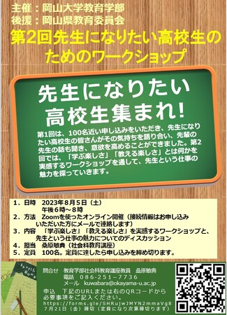 【岡山大学】岡山大学教育学部主催「第2回 先生になりたい高校生のためのワークショップ」〔8/5,土 オンライン〕