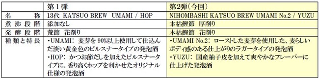 株式会社にんべん(東京都中央区、代表取締役社長 高津伊兵衛)は、株式会社ジウ(東京都中央区、代表取締役社長 下田和幸)が日本橋で営むマイクロブルワリー「2杯目のビール。」にて、かつお節だしのうま味を活かした発泡酒第2弾を開発しました。今回は、前回比2倍以上の鰹節を2段仕込みで使用し、さらにかつお節だしのうま味を感じられる仕上がりになっています。ローストした麦芽を使用し、ボディ感のあるスタイルでかつお節だしとマッチした「NIHOMBASHI KATSUO BREW UMAMI No.2」、かつお節だしのうま味と爽やかな柚子のフレーバーを愉しめる「NIHOMBASHI KATSUO BREW YUZU」の2種類を2023年7月13日(木)より数量限定で発売いたします。