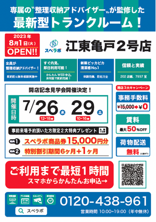 【江東亀戸2号店/8月1日(火)オープン】見学から契約、解約まで完全非接触・非対面、お申し込みからご利用まで最短1時間!都内、大阪などにて絶賛運営中のトランクルーム【スペラボ】が亀戸駅近くに出店!
