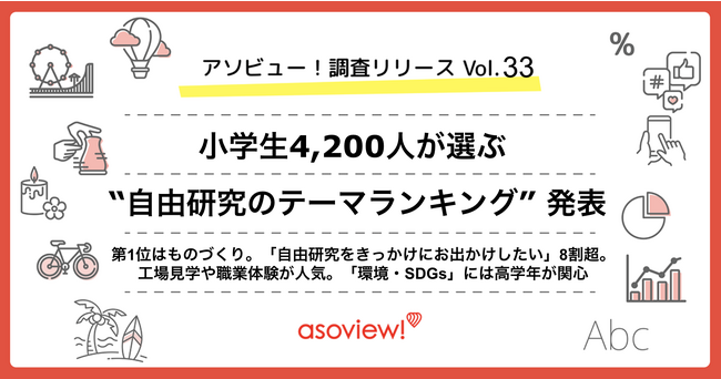 休日の便利でお得な遊び予約サイト「アソビュー!」(URL:https://www.asoview.com/、以下:アソビュー!)を運営するアソビュー株式会社(所在地:東京都品川区、代表執行役員CEO:山野智久、以下、当社)は、まもなく迎える夏休みを前に、今年の自由研究テーマについて、小学生と小学生の子どもを持つアソビュー!会員(n=4,268)にアンケート調査を行いました。その結果を「2023年夏休みの自由研究テーマランキング」として発表いたします。