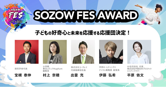 「好奇心と可能性を解き放ち、未来をSOZOWする学びの生態系をつくる」をビジョンに掲げるSOZOW株式会社(所在地:東京都品川区、代表取締役:小助川 将)は、株式会社テレビ朝日と共同開催する親子体験型オンラインフェス「SOZOW FES 2023 Summer with テレビ朝日」(7月22日~8月6日開催)の中で実施する子どものプレゼン大会「SOZOW FES AWARD」に子どもの好奇心を応援する「応援団」として参画いただくメンバーが決定したことをお知らせいたします。