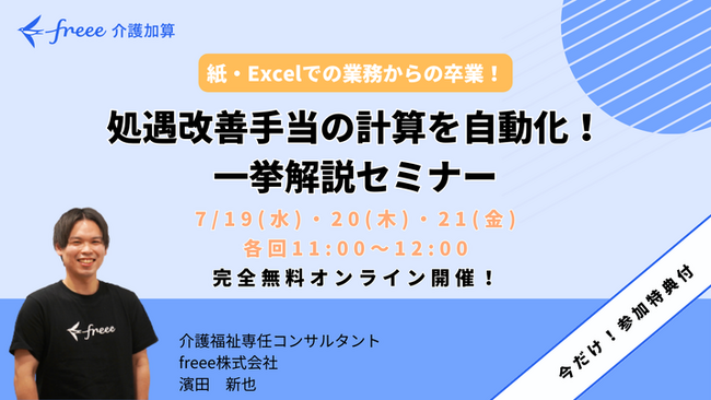 freee株式会社(本社:東京都品川区、CEO:佐々木大輔、以下「freee」)は7月19日(水)、20日(木)、21日(金)の3日間で「処遇改善手当の計算を自動化!一挙解説セミナー」をオンラインで開催します。