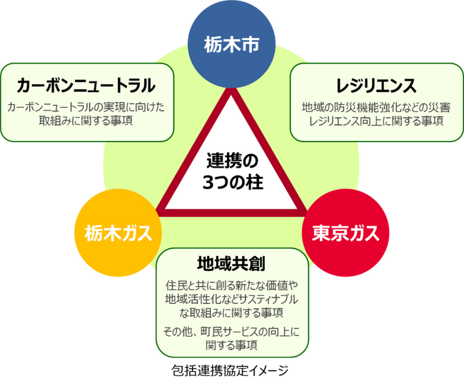 栃木市(市長:大川 秀子)、栃木ガス株式会社(社長:柳川 延夫、以下「栃木ガス」)、東京ガス株式会社(社長:笹山 晋一、以下「東京ガス」)は、このたび、「カーボンニュートラルシティ実現に向けた包括連携協定」(以下、「本協定」)を締結しました。