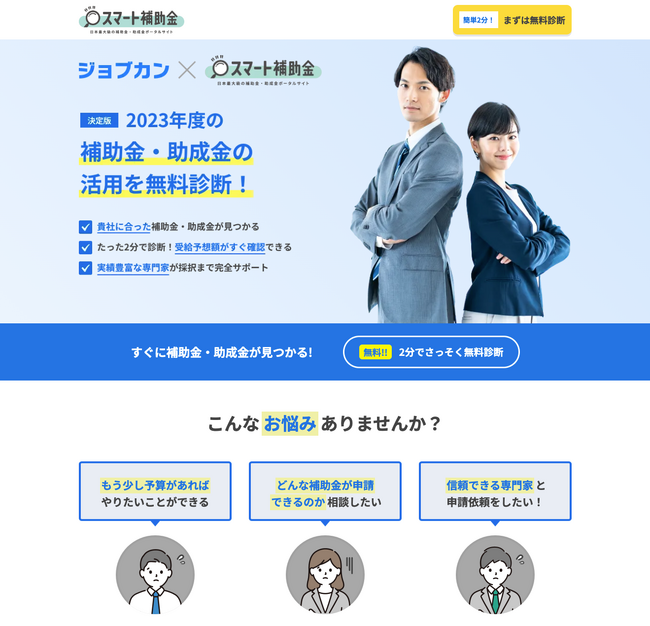 全ての企業の成長基盤となることを目指す「ジョブカン」は、ユーザー企業のさらなる成長を支援するため、補助金・助成金情報を掲載する日本最大級のポータルサイト「スマート補助金」と連携した『補助金相談窓口』の設置と「補助金・助成金診断」の無償提供を開始いたしました。