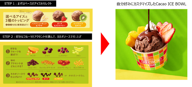 特長:3つの産地の「Cacao ICE」とフルーツの組み合わせを選び、お好みのフルーツと、ラムレーズン、オレンジピールなどのアクセントを組み合わせ、さらに3つの産地からカカオソースを選んで、自分好みにカスタマイズした「Cacao ICE BOWL」。自分ならではの食べ方を見つけて、「Cacao ICE」をもっと楽しんでみてはいかがですか?