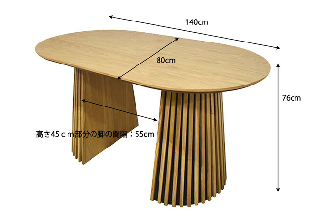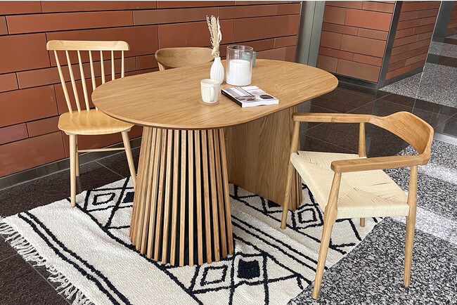 厚みのないオーバル型の天板とルーバー状の脚が特徴的な、NOCEならではのデザイン性の高いダイニングテーブルです。オーバル型は円形の柔らかさと、天板の面積広く使えるメリットがあります。オーク天然木でつくられており、オークの特長である木目の美しさが表現されていて、高級感があります。