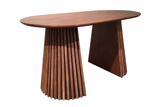 そしてこのダイニングテーブルの最大の特徴が、ルーバーのように縦の棒で構成させた脚です。円錐形を半分にし、天板の両サイドに配置させています。2名で向き合ってゆったりとご使用いただけます。厚みのない天板とボリュームのある脚の絶妙なバランスが、このダイニングテーブルのデザイン性を一層高めています。
