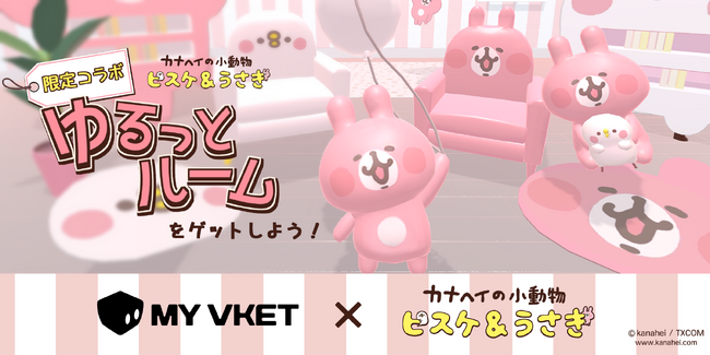 人気キャラクター「カナヘイの小動物」が、スマホから楽しめるメタバースサービス「My Vket」とコラボ!My Vket内の自分だけのバーチャルルームが作成できるマイルーム機能のテンプレートに、『カナヘイの小動物 ピスケ&うさぎのゆるっとルーム』が登場し、無料で使用することが可能です。