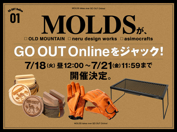 期間中はGO OUT OnlineのTOPページに表示されるのはすべて『MOLDS』関連のアイテムというまさにサイトジャックともいえるスペシャル企画。ソールドアウト必至の貴重なコラボアイテムはもちろん、フィールドで存在感を放つ新作モデルも網羅。ココでしかないスペシャル企画を展開いたします!!