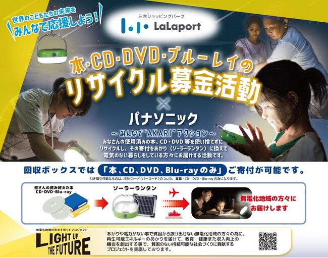 首都圏地区の6つのららぽーと施設内に「みんなで”AKARI”アクション」のリサイクル募金用の寄付ボックスを設置し、読み終えた本やCD、DVD、ブルーレイの寄付を呼びかけます。寄付いただいたリサイクル品は嵯峨野株式会社が運営するサービス「きしゃぽん」を通じて買い取りを行い、その金額をソーラーランタンに換えてアジアやアフリカの電気のない暮らしをしている方々にお届けします。