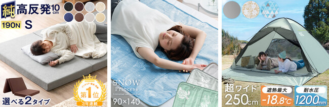 (↑左から、3つ折り高反発マットレス、瞬間冷却 ひんやりマット超ワイド250cmポップアップテント)