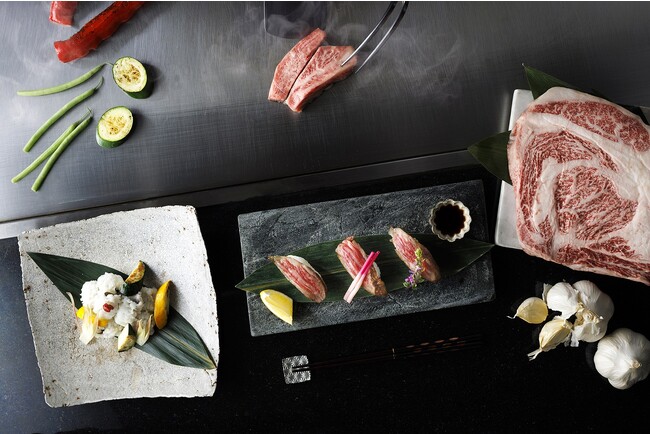 食欲が落ちる暑い夏に、目の前で食欲そそる音や香りが五感を刺激する鉄板焼きで、エネルギーをリチャージしていただけるように、関西の夏の風物詩“鱧”をはじめ、スタミナ食とも言われる「肉」や「にら」「にんにく」などを随所に取り入れたコースをご用意いたします。目の前でさっと火を通した黒毛和牛の炙り寿しは、3種の味わいでお楽しみいただけます。ソテーした鱧は、相性の良い梅肉ソースとともに。ポークとにら炒めは、フレッシュサラダにトッピングいたしました。メインには、黒毛和牛のロース肉をブランデーでフランベした一品を。芳醇な肉の香りが食欲を掻き立てます。〆には、にんにくをたっぷりと効かせたガーリックライスに、温泉玉子を添えてご提供いたします。また同期間、発酵・熟成させた黒にんにくをペーストし醸造したビール「青森ニンニク黒エール」も販売いたします。
