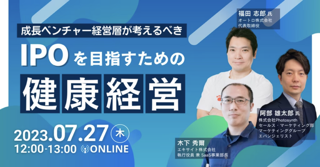 エキサイト株式会社(所在地:東京都港区、代表取締役社長:西條 晋一)は、オートロ株式会社、株式会社Photosynthの3社合同で「成長ベンチャー経営層が考えるべきIPOを目指すための健康経営」をテーマに、2023年7月27日(木)12:00~参加費無料ウェビナーを開催します。