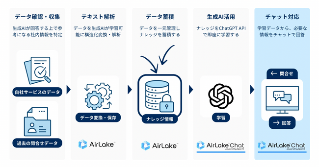 当社は、非構造化データを高速に蓄積し、リアルタイムで解析可能な状態にする機能を持つ「AirLake」を開発するなど、非構造化データの活用に関する知識と実績があります。当社の技術とOpenAI社の高度な自然言語処理能力を組み合わせることで、新たなDXの可能性を生み出すために「AirLake Chat」を開発しました。
