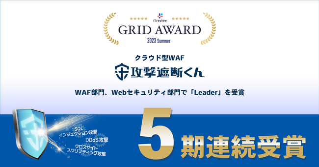 グローバルセキュリティメーカーの株式会社サイバーセキュリティクラウド(本社:東京都品川区、代表取締役社長 兼CEO:小池 敏弘、以下「当社」)が開発・提供するクラウド型WAF『攻撃遮断くん』が、2022年から5期連続でWAF部門、Webセキュリティ部門において満足度・認知度ともに優れた製品であると評価されたサービスに送られる『ITreview Grid Award 2023 Summer』を受賞したことをお知らせします。