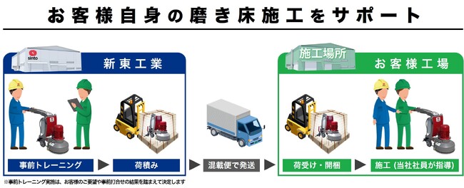 今回当社が新しく提供するプログラムでは、施工機材と当社技術員の派遣対応を行うことで、お客様やお客様の協力会社の手で、お客様の工場の床改修・磨き床施工を行うことが可能になります。特に中・小規模の既設床の改修や、改善作業において活用できるプログラムとなります。