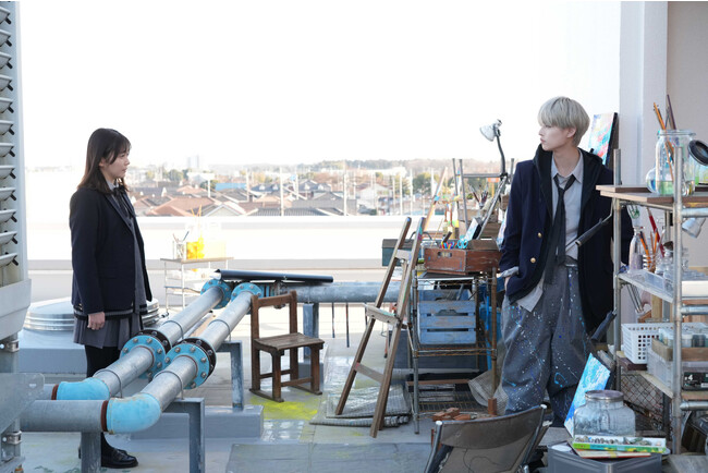 今回新しく解禁された計4枚の場面写真は、久間田琳加演じる学校ではマスクが手放せず、本心を隠して生きる優等生の茜が、自分とは正反対の性格のクラスメイト・青磁(白岩瑠姫さん)との出会いによって徐々に心のドアを開き、恋に落ちていく様を切り取ったものになっています。周りから見た自分の印象についてのアンケート結果を美術の授業中に緊張した様子で発表をしている姿や、バスの窓に浮かび上がったハートマークをうっとりと見つめる様、学校の屋上にある青磁のアトリエを訪れ、マスクを外した茜が屋上で青磁と見つめ合う姿など、いずれも茜の感情やキャラクターがしかと伝わる魅力的なカットとなっています。