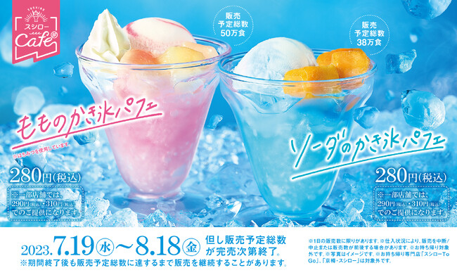 株式会社あきんどスシロー(本社:大阪府吹田市、代表取締役社長:新居 耕平)は、“スシローカフェ部”から新作スイーツとして、「もものかき氷パフェ」と「ソーダのかき氷パフェ」を7月19日(水)より全国のスシローにて販売いたします。