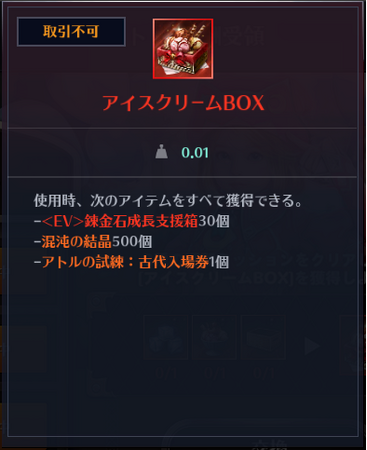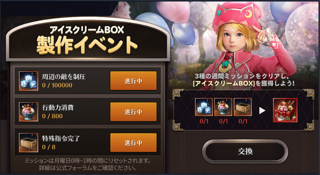 イベント期間中に週間ミッションをクリアすると、「溶けない氷」「アイスクリーム」「何も入ってない箱」を獲得できます。獲得した「溶けない氷」「アイスクリーム」「何も入ってない箱」は、イベントページにて「交換」ボタンをタップすると「アイスクリームBOX」と交換することができます。
