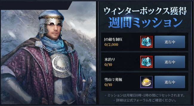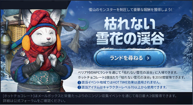 イベント期間中、毎日0:00に「ホットチョコレート」1個がメールボックスへ支給され、アイテムを使用することによりべリア村のNPC「ランド」を通じて「枯れない雪花の渓谷」へ入場することができます。「枯れない雪花の渓谷」にて周辺の敵を制圧すると、豪華アイテムを獲得することができます。詳細は以下URLをご参照ください。